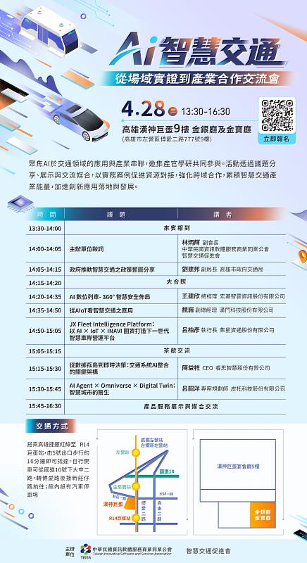 為促進人工智慧於交通領域的應用落地與產業交流合作,中華民國資訊軟體服務商業同業公會–智慧交通促進會將於4月28日(13:30-16:30),假高雄漢神巨蛋9樓金銀廳及金寶廳舉辦「AI智慧交通:從場域實證到產業合作交流會」,邀集政府代表、產業專家及企業先進,共同探討AI、物聯網及數位孿生等創新技術於智慧交通場域中的應用成果與發展趨勢。